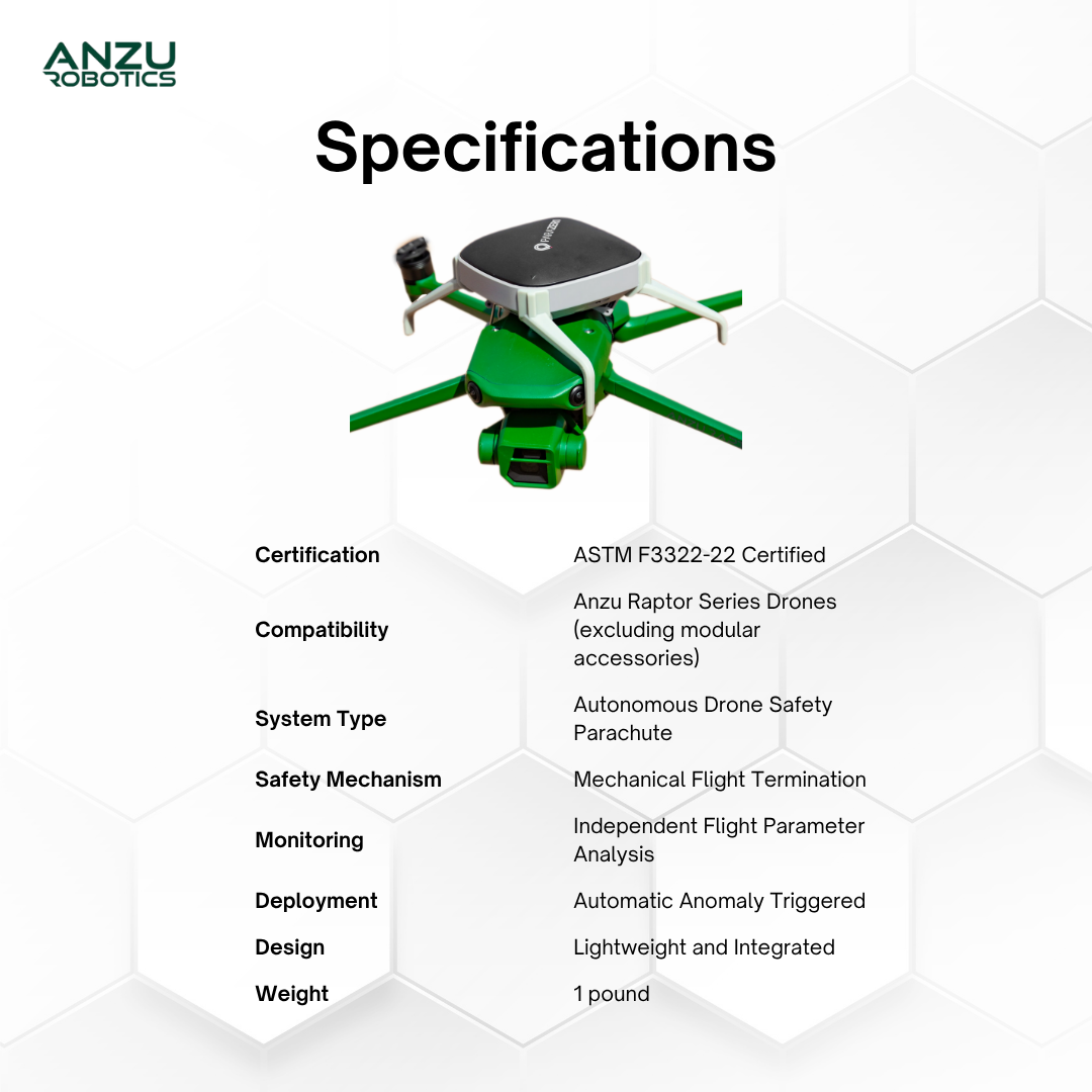 Experience unparalleled flight safety with the Anzu Raptor Autonomous Parachute System, engineered to protect your drone and payload during unexpected flight anomalies. This intelligent safety module continuously monitors critical flight parameters, deploying the parachute automatically when needed to ensure a controlled descent and minimize damage. Certified to meet rigorous industry standards, it provides pilots with unmatched peace of mind and operational security.
