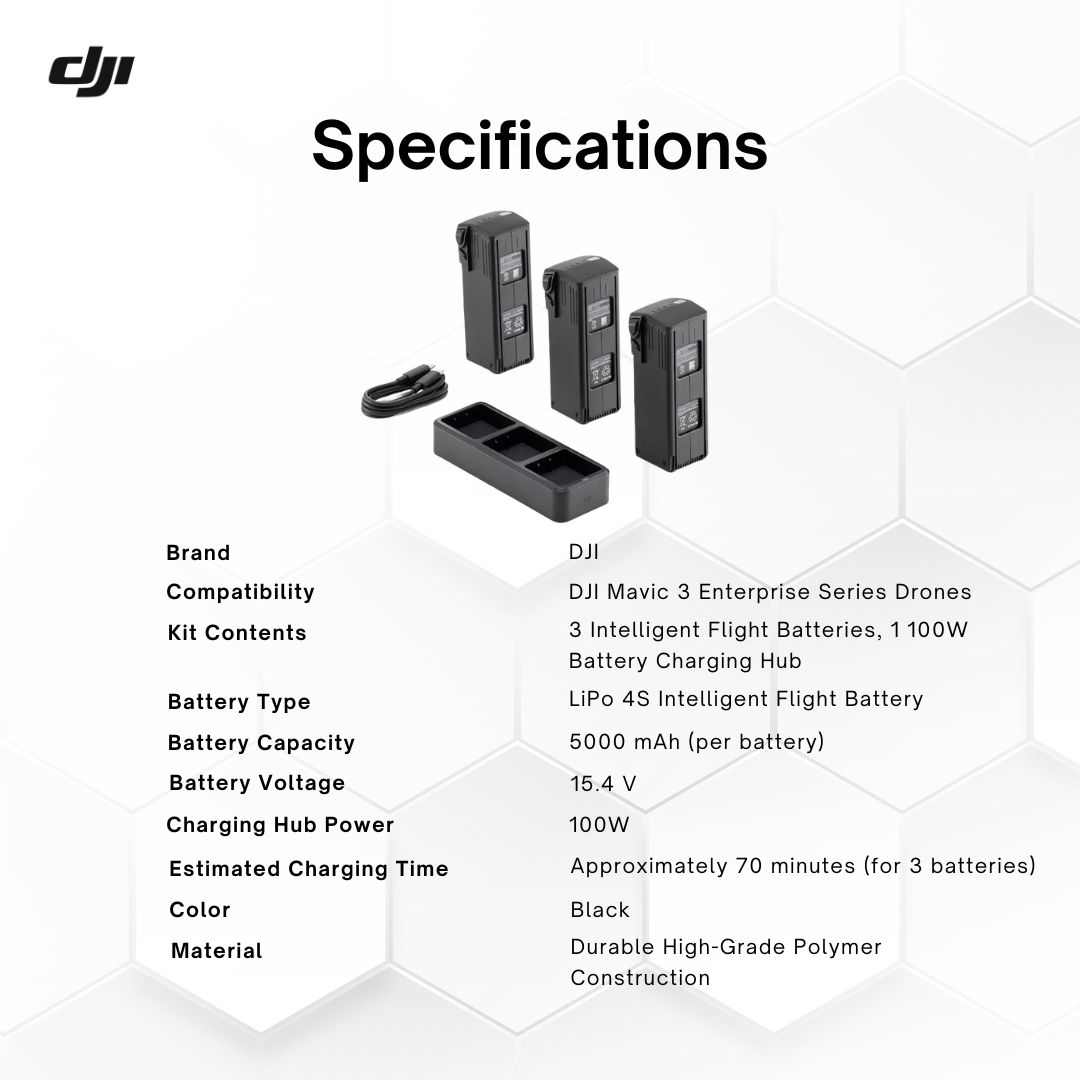 Stay flight-ready with the DJI Mavic 3 Enterprise Series Battery Kit — a complete power solution for professionals who demand endurance and reliability in every mission. This kit equips your fleet with the energy needed for extended operations, fast charging, and seamless workflow efficiency.
