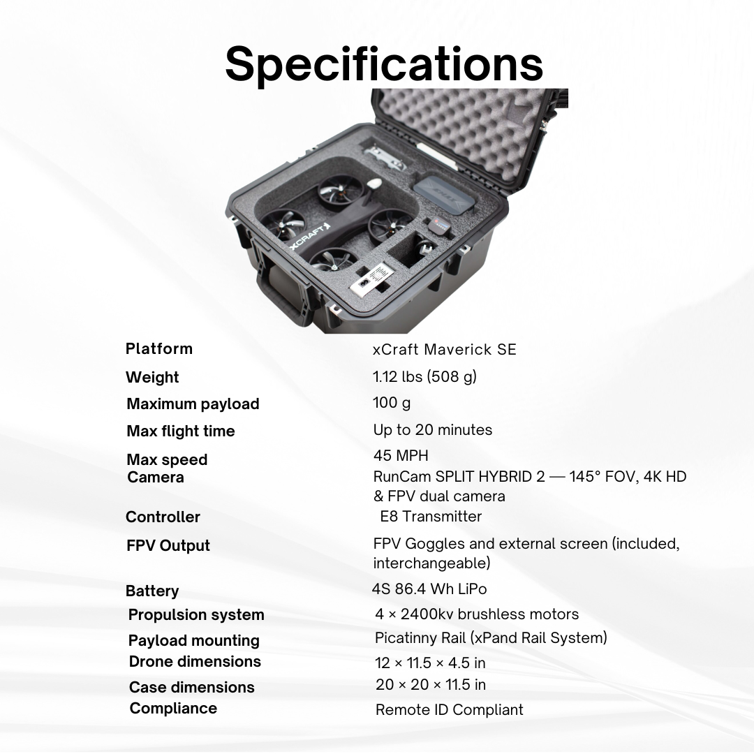 Whether you're training, racing, or deploying onboard tools via its integrated Picatinny rail, the Maverick SE delivers exceptional maneuverability, high-definition video, and intuitive control — all in a ready-to-fly system that’s Remote ID-compliant and built for action.
