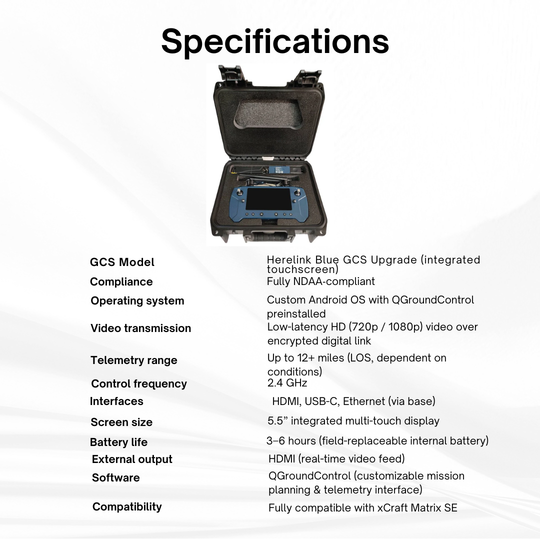 Upgrade your xCraft Matrix SE with the Herelink Blue GCS and unlock the full potential of your aerial platform. Whether you're performing critical deliveries, live inspections, or tactical operations, the Herelink Blue ensures secure communications, precision flight, and complete regulatory compliance.