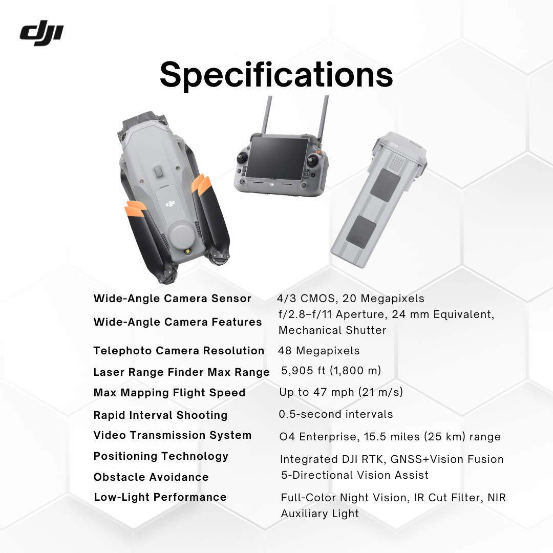 - Photo Format: DJI Matrice 4T: JPEG, DJI Matrice 4E: Wide: JPEG/DNG (RAW), Medium Tele Camera: JPEG, Telephoto: JPEG