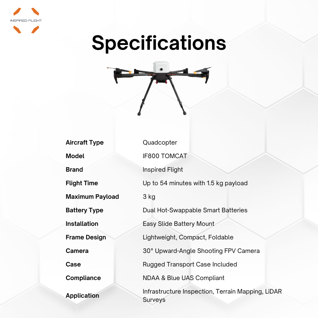 The Inspired Flight IF800 TOMCAT redefines enterprise-grade aerial operations with its lightweight, compact, and foldable design. Engineered for maximum performance and reliability, this drone is ideal for infrastructure inspections, terrain mapping, and LiDAR surveys. Its rugged transport case provides secure storage for batteries and payloads, ensuring convenience and protection during travel and field deployment.