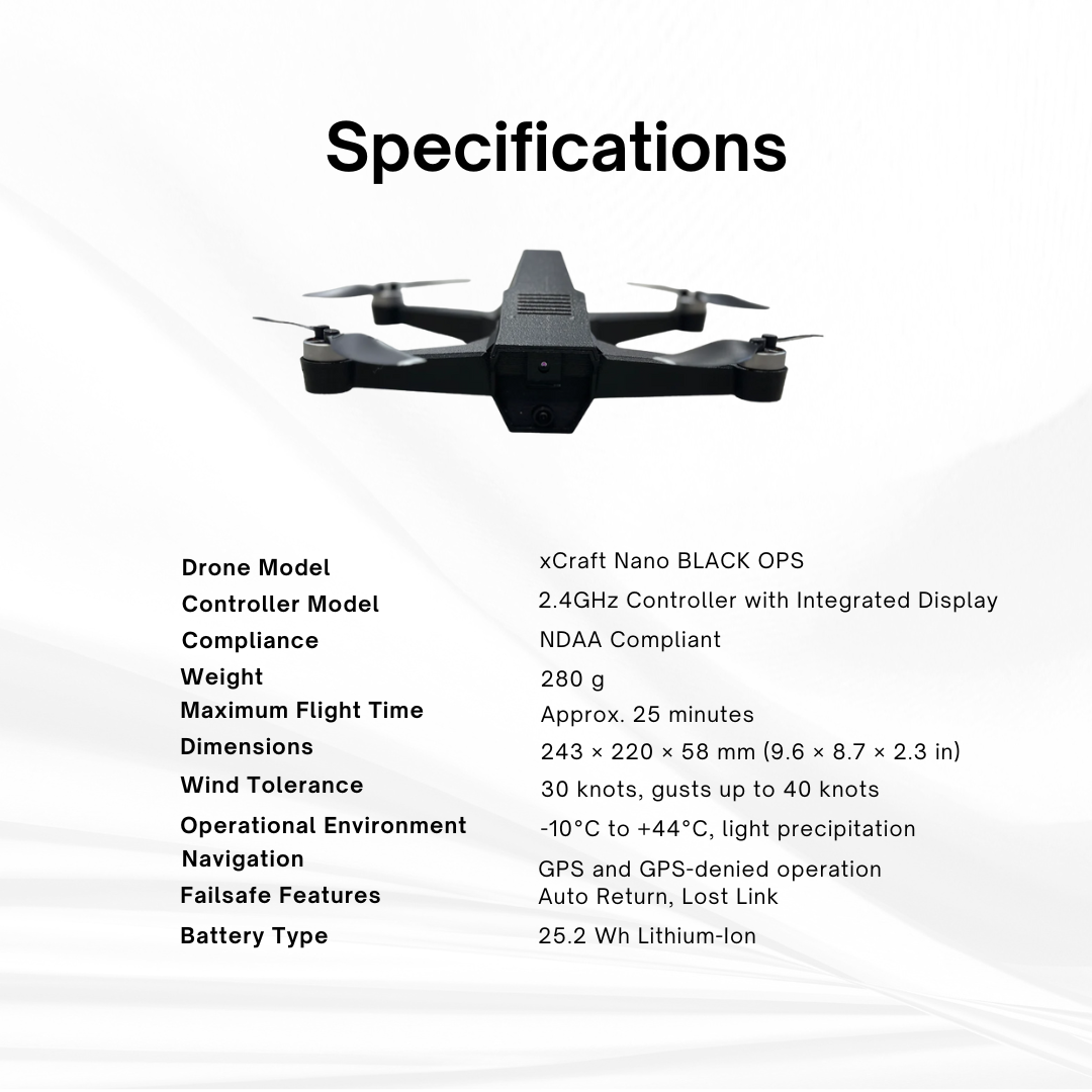 Command the skies with the xCraft Nano BLACK OPS — the ultimate recon drone that combines cutting-edge technology, mission versatility, and dependable performance in one tactical platform.